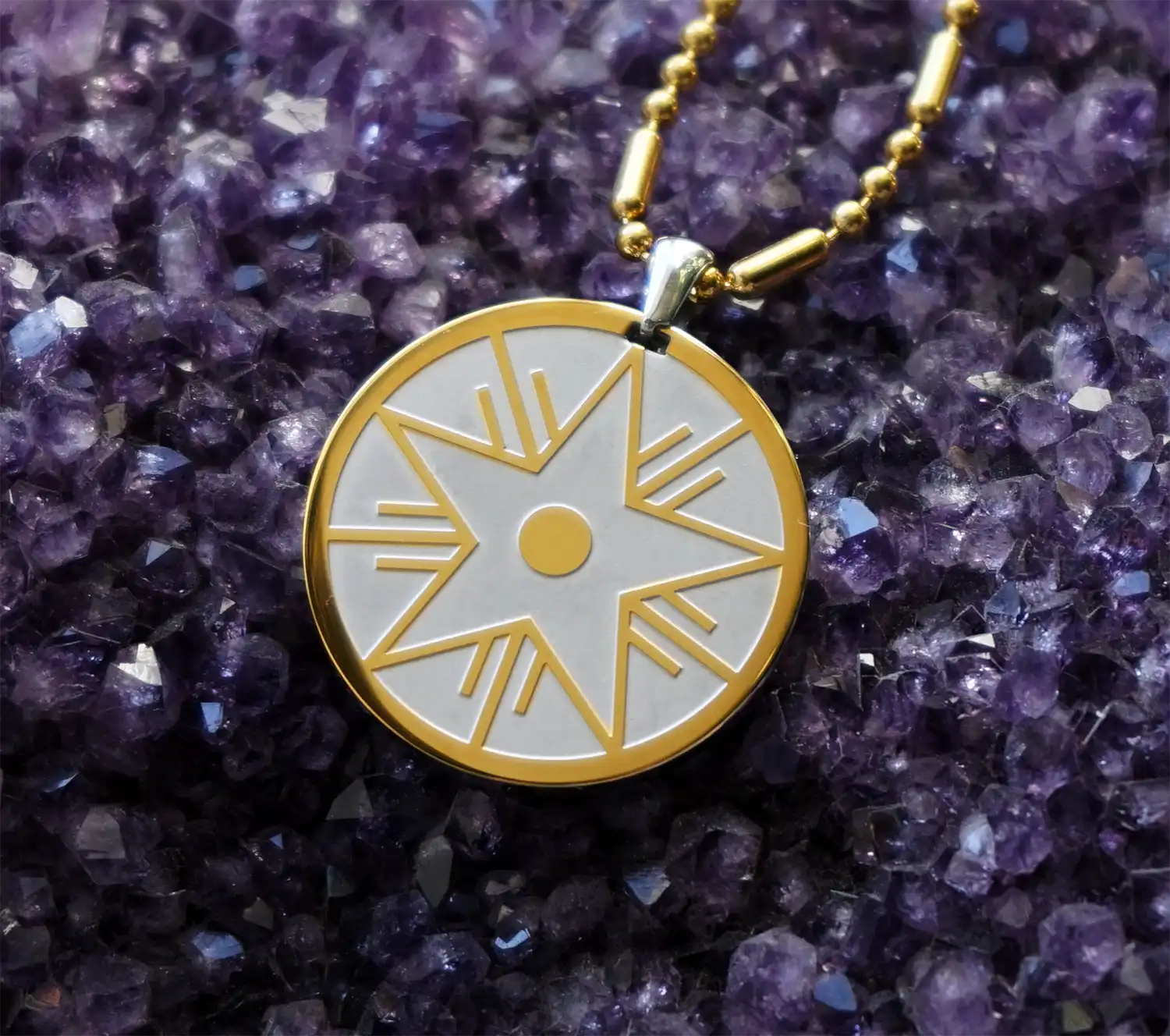 L’Étoile est un symbole ancien de paix universelle et de protection. Représentée par une étoile à cinq branches que l’on nomme aussi pentagramme, inscrite dans un cercle, elle incarne l’unité, l’harmonie et la connexion à l’Univers. Les quatre pointes inférieures symbolisent les éléments fondamentaux : la Terre, l’Air, le Feu et l’Eau, tandis que la cinquième pointe, orientée vers le haut, représente l’Esprit, le cinquième élément, source d’élévation et de conscience.